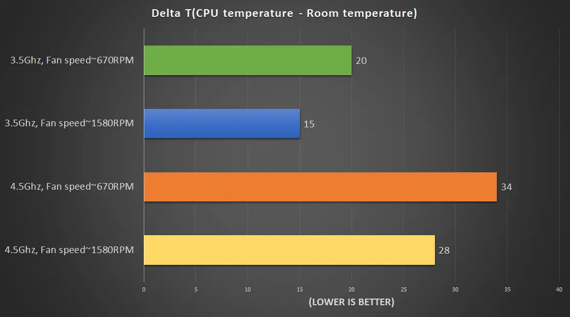 The temperatures were very good and healthy for the processor. If a non-overclocker uses this cooler on his CPU at full load with minimum or standard fan speed, then expect the temperature to be around 50C but the fans came up to perform really well when they were running at full speed. The temperature went down up to 6C both at 3.5Ghz and 4.5Ghz but creating a little noise. Although, it wasn’t disturbing at all. At silent profile with around 670RPM speed, there was almost no noise from 1 meter away and this thing is very quiet even if the side panel is removed.