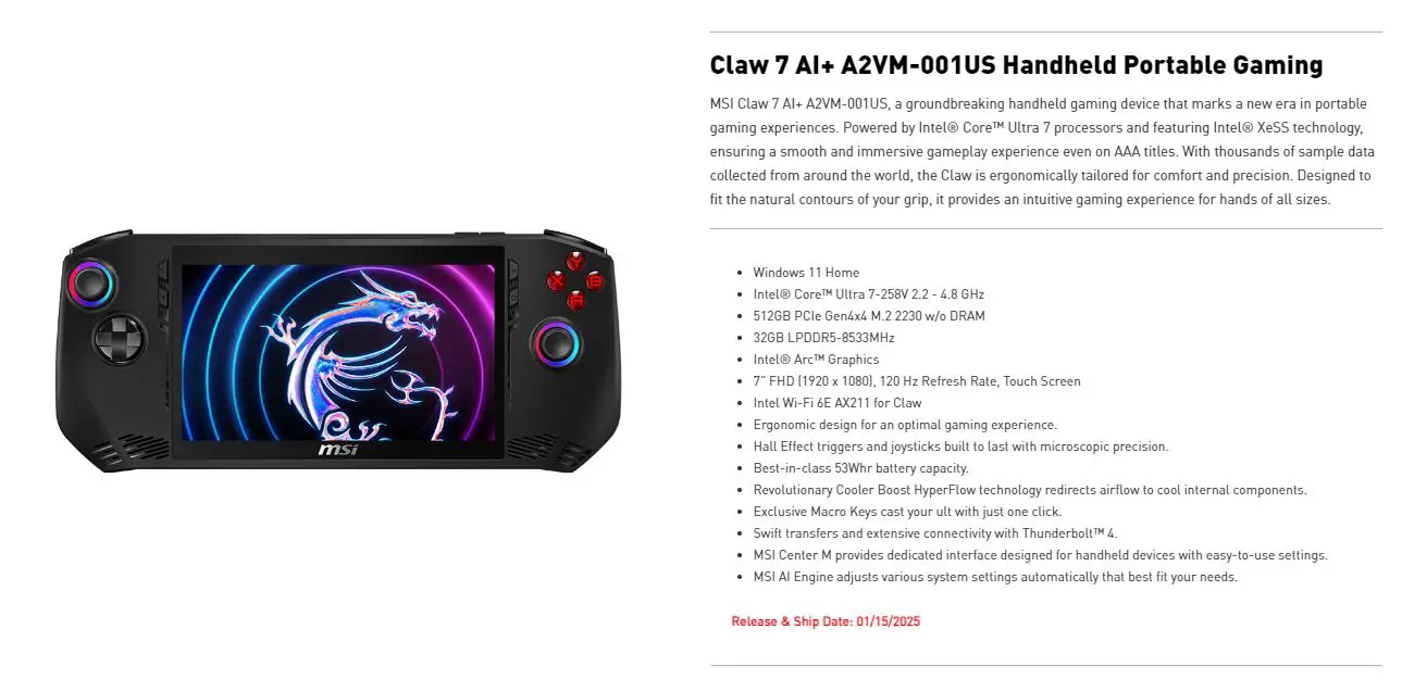 On both handheld pages as visible on the official MSI store for the US, under the description of handhelds, the Release and Shipping date is clearly mentioned as “01/15/2025”. With the purchase, users will get free shipping and will get a 1-year limited warranty. This is right now applicable for the US residents but other NA regions may see the handhelds a few days later.