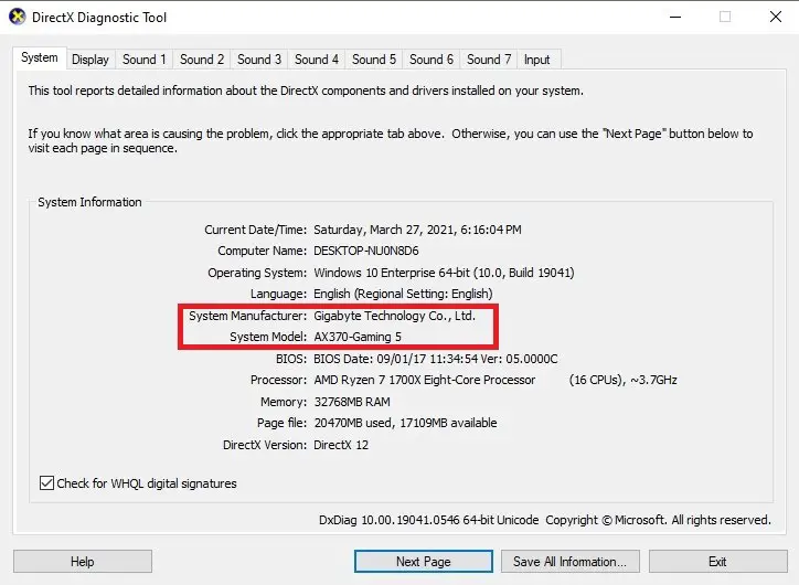 Using the DirectX Window you can easily know about your motherboard model and its manufacturer.